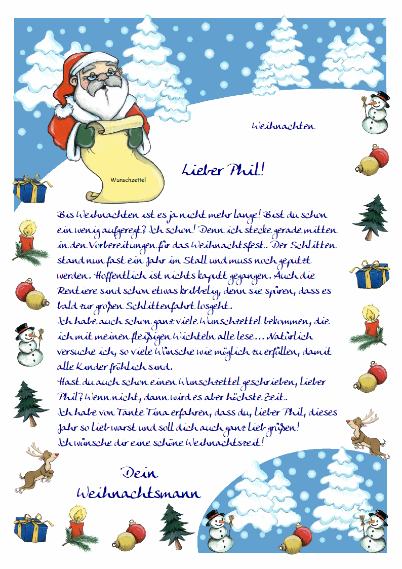 Ihr Brief ist sehr gut angekommen. Unser Moritz konnte es kaum fassen, dass wirklich der Weihnachtsmann an ihn einen Brief geschrieben hat und hat die nächsten Tage den Brief immer mit sich herumgetragen, bis es auch alle wußten...