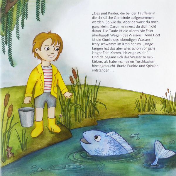 Als zentrale christliche Symbole bilden „Wasser“ und „Fisch“ den roten Faden in unserer personalisierten Kinderbibel. Der Fisch Ichty nimmt den Täufling mit auf eine Reise durch die Welt der Bibel.