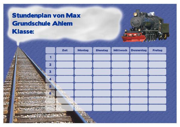 Mit dem wunderschönen Stundenplan macht die Schule Spaß! Die schöne alte Dampflok und die in der Ferne verschwindenden Gleise lassen das Herz jedes kleinen Lokführers höher schlagen.
