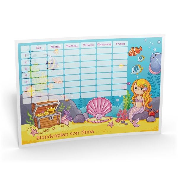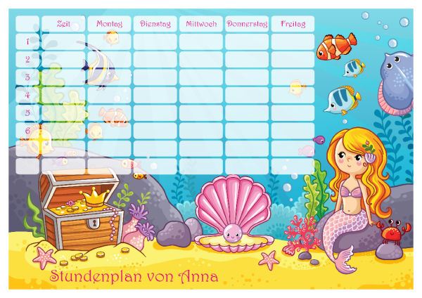 Mit dem wunderschönen Stundenplan macht die Schule Spaß! Die kleine Meerjungfrau ist in ihrem Element umgeben von Fischen, Seesternen, einem lustigen Krebs und einer großen Muschel.